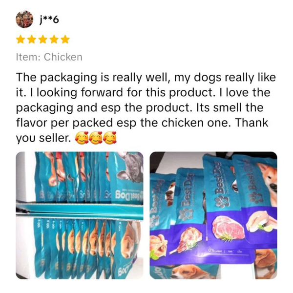 The packaging is really well, my dogs really like it. I looking forward for this product. I love the packaging and esp the product. Its smell the flavor per packed esp the chicken one. Thank you seller. 🥰🥰🥰